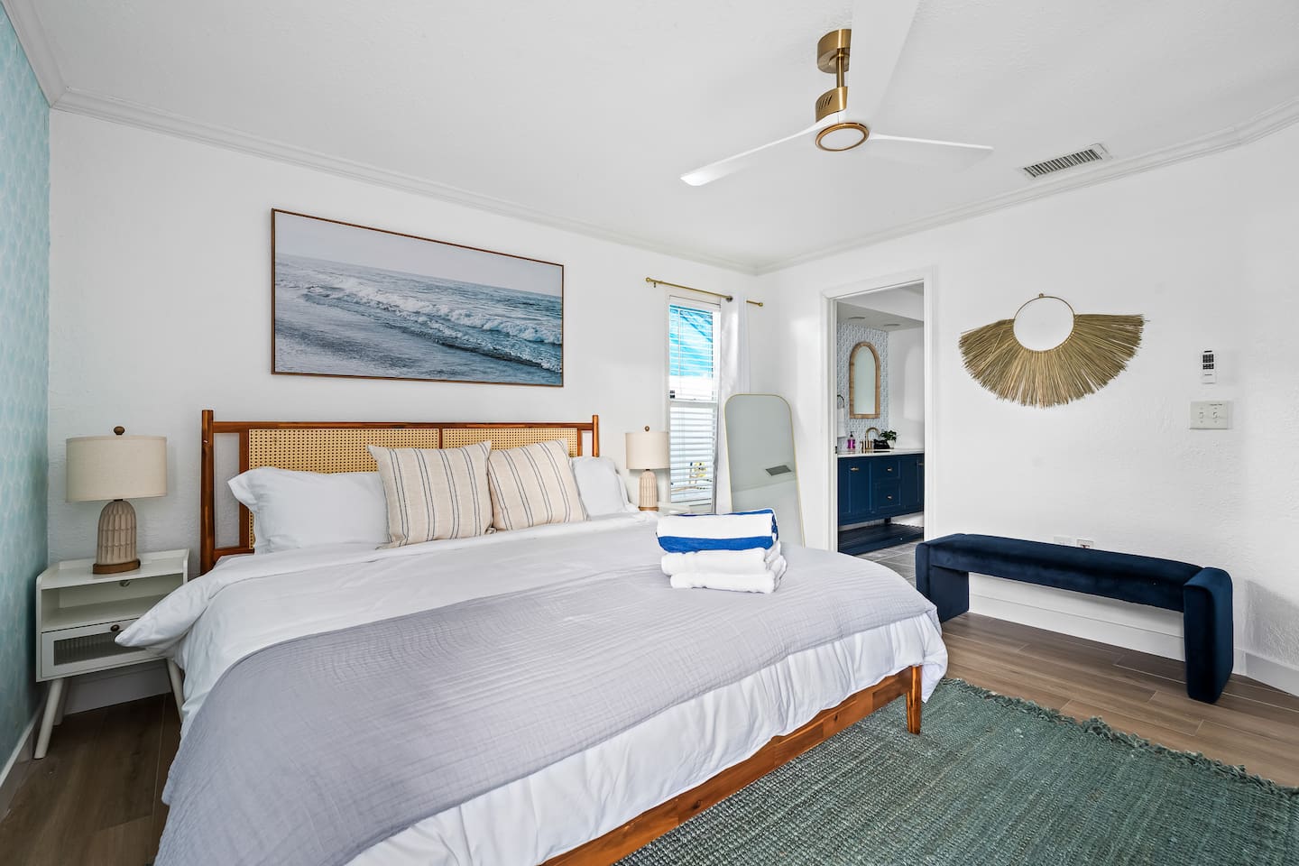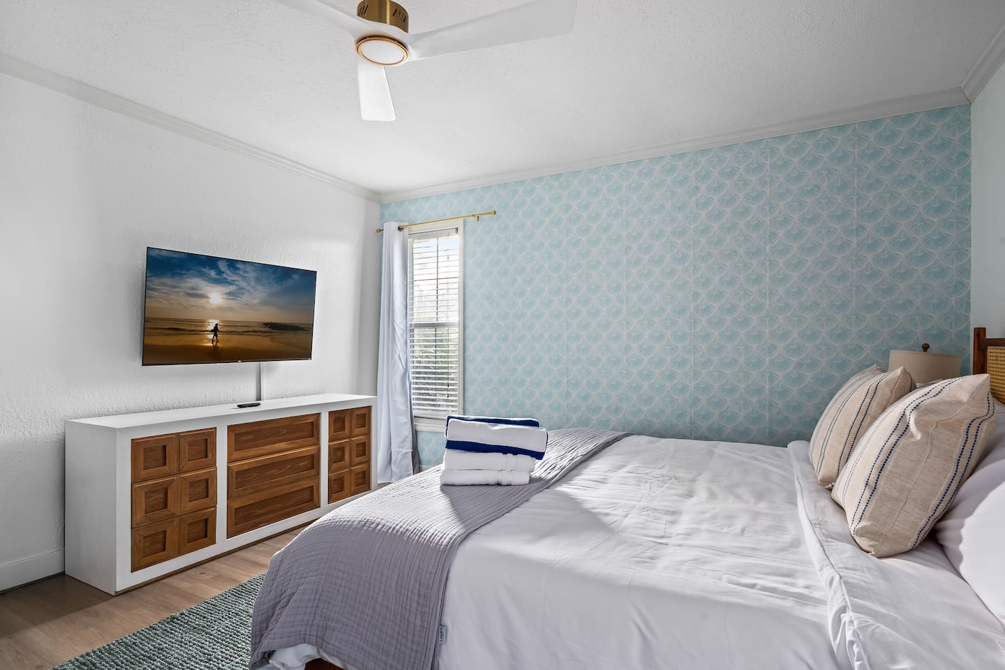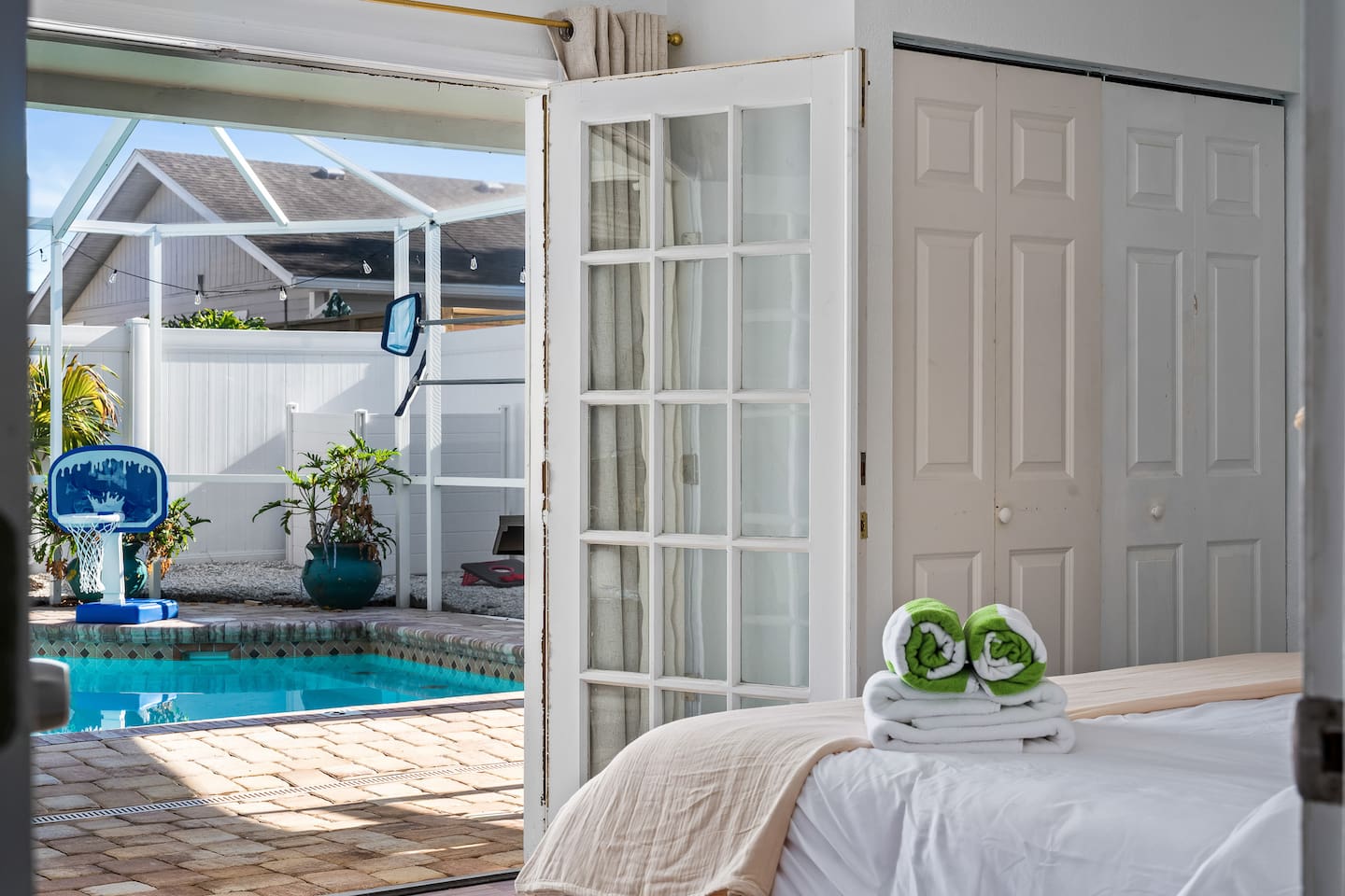 🏖️ Blue Waves Getaway | Coastal Fun for the Whole Crew! Sleeps 11 • 4 Bedrooms • 2 Bathrooms • Heated Pool • Hot Tub • Indoor & Outdoor Movie Theaters • Sensory Space • Putting Green • Sandpit • Fire Pit • Karaoke • Pool Table• Air Hockey • Ping Pong • Shuffleboard • Grill Welcome to Blue Waves Getaway, your dreamy coastal retreat in Bradenton, Florida! Designed with families in mind, this 4-bedroom, 2-bath escape blends beachy charm with endless entertainment—from indoor and outdoor movie theaters, to a kid-friendly sensory space, to a backyard oasis complete with a pool & hot tub with pull down Movie Screen, a putting green, kids sandpit and fireplace overlooking the green. Whether you're enjoying sunny poolside afternoons or winding down with a movie under the stars, Blue Waves Getaway is the ultimate spot to relax, play, and make unforgettable memories. 🗺️ Distance to Popular Attractions De Soto National Memorial 8-minute drive | 📍 3.3 miles 📌 8300 De Soto Memorial Hwy, Bradenton, FL 34209 The Bishop Museum 8-minute drive | 📍 3.3 miles 📌 201 10th St W, Bradenton, FL 34205 Riverwalk 9-minute drive | 📍 3.4 miles 📌 452 3rd Ave W, Bradenton, FL 34205 LECOM Park 10-minute drive | 📍 3.8 miles 📌 1611 9th St W, Bradenton, FL 34205 Robinson Preserve 11-minute drive | 📍 4 miles 📌 1704 99th St NW, Bradenton, FL 34209 Anna Maria Island 23-minute drive | 📍 6.9 miles 📌 101 Elm Ave, Anna Maria, FL 34216 IMG Academy 17-minute drive | 📍 7.6 miles 📌 4350 El Conquistador Pkwy, Bradenton, FL 34210 Bradenton Beach 16-minute drive | 📍 7.9 miles 📌 611 FL-789, Bradenton Beach, FL 34217 Bradenton Airport (Sarasota–Bradenton Intl - SRQ) 30-minute drive | 📍 13.9 miles 📌 6000 Airport Cir, Sarasota, FL 34243 Room-by-Room Breakdown 🌊 The Driftwood Suite (Primary Bedroom) This serene master suite features a king bed, ensuite bathroom with double vanity and a walk-in shower (no tub). You'll also find: - Smart TV - Dresser - Walk-in closet - Full-length standing mirror - Seating ottoman - Blackout curtains for those extra-lazy mornings - Nightstands with built-in charging ports 🏄♀️ The Surf Shack (Kids’ Room) This bright, playful room sleeps up to 5 kids with a L-shaped bunk bed and trundle (all twin-sized). Designed for fun, creativity, and comfort, this room includes: - Fun Surf theme - A reading nook with books for bedtime stories - Wall-mounted tic-tac-toe - Closet converted into a sensory space featuring: - Chalkboard wall - Whiteboard - Tactile sensory panels - Sparkling sequin wall - Smart TV when Mom and Dad need a break - Dresser 🌴 The Pink Palm Room (King Bedroom #2) Relax in tropical comfort with: - A plush king bed - Smart TV - Dresser - Lamps with built-in charging ports 🌺 The Sanddollar (King Bedroom #3) Another peaceful escape featuring: - Cozy king bed - TV & dresser - Nightstands with built-in charging ports ✨ Features & Amenities: - 🏊♀️ Private Pool + Hot Tub - 🎬 Indoor Theater Room with Karaoke Machine - 🌌 Outdoor Movie Theater viewable from the pool and hot tub - 🧠 Kids’ Sensory Space - 🏌️♂️ Putting Green & Sand Play Pit - 🔥 Outdoor Fireplace + Lounge Seating - 📺 Smart TVs in every bedroom - 🚿 2 Full Bathrooms - 🍽️ Fully Stocked Kitchen - 🧺 Washer & Dryer - 🛜 High-Speed WiFi - 🅿️ Free Parking - ☀️ Just Minutes from Beaches, Dining, & Shops!