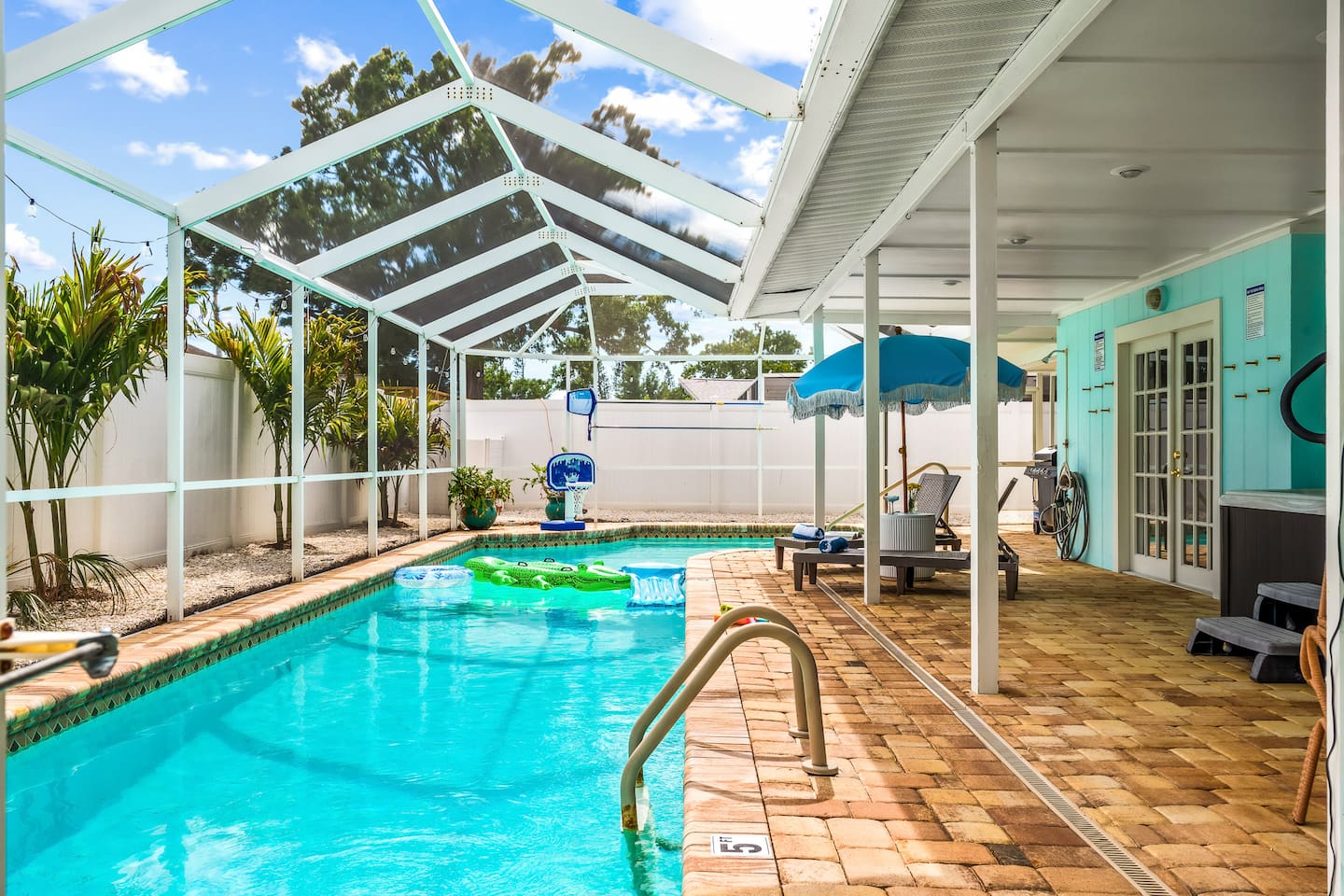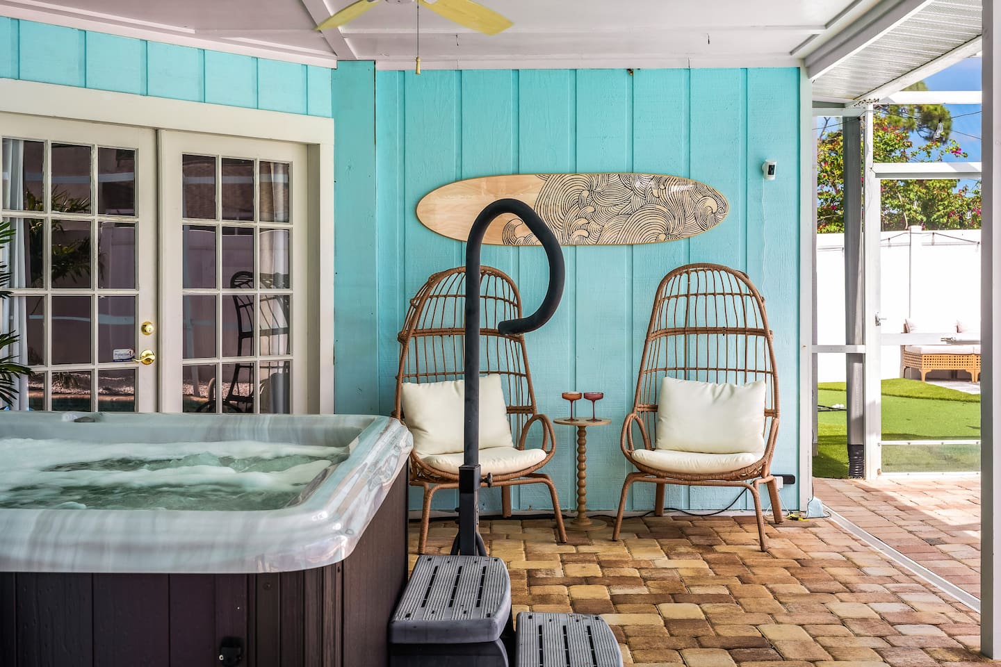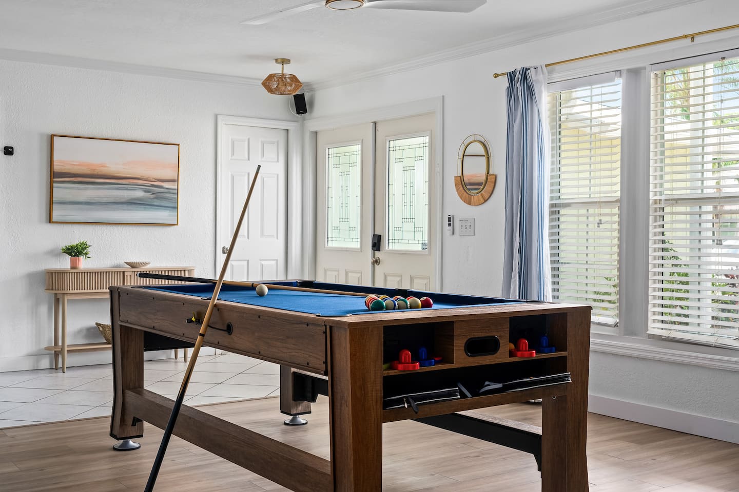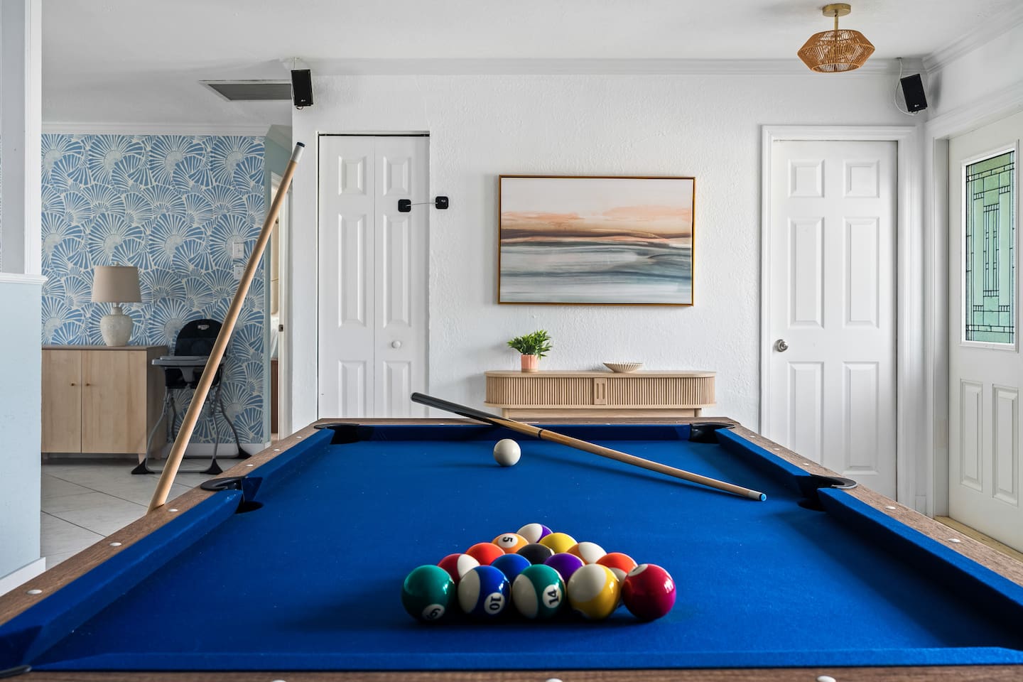 This isn’t just a vacation home — it’s Blue Waves Getaway, where every room brings a splash of coastal charm and every corner invites connection, creativity, and fun. Perfect for family gatherings, multi-generational trips, or groups looking for a Florida stay full of sunshine and smiles. Sleeps 11 • 4 Bedrooms • 2 Bathrooms • Heated Pool • Hot Tub • Movie Theaters • Putting Green • Sandpit • Fire Pit • Karaoke • Pool Table• Air Hockey • Ping Pong • Shuffleboard