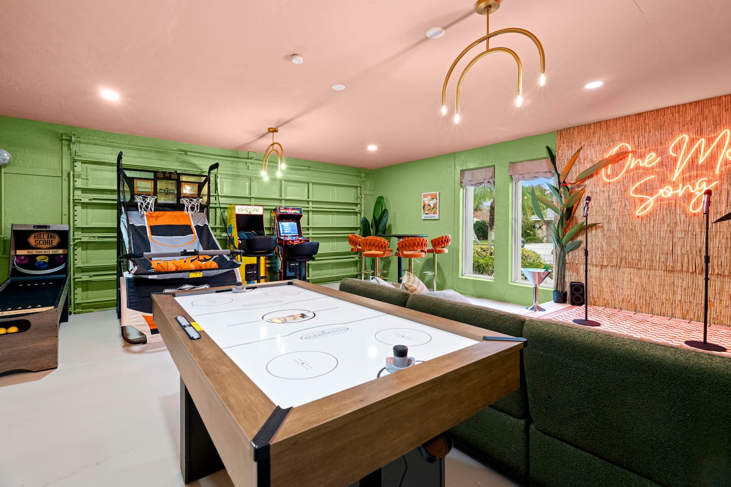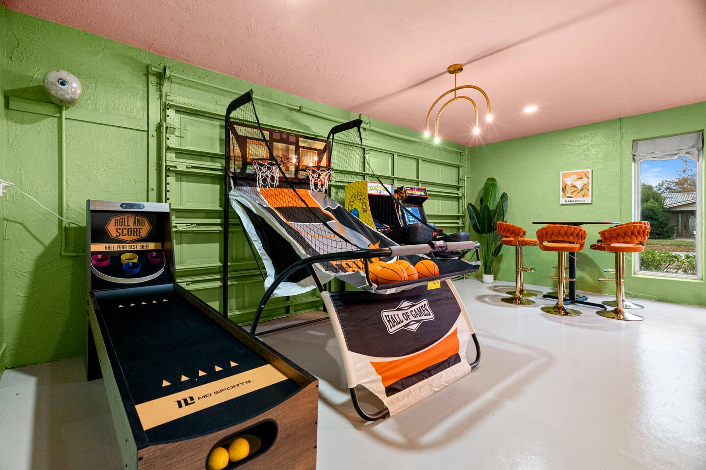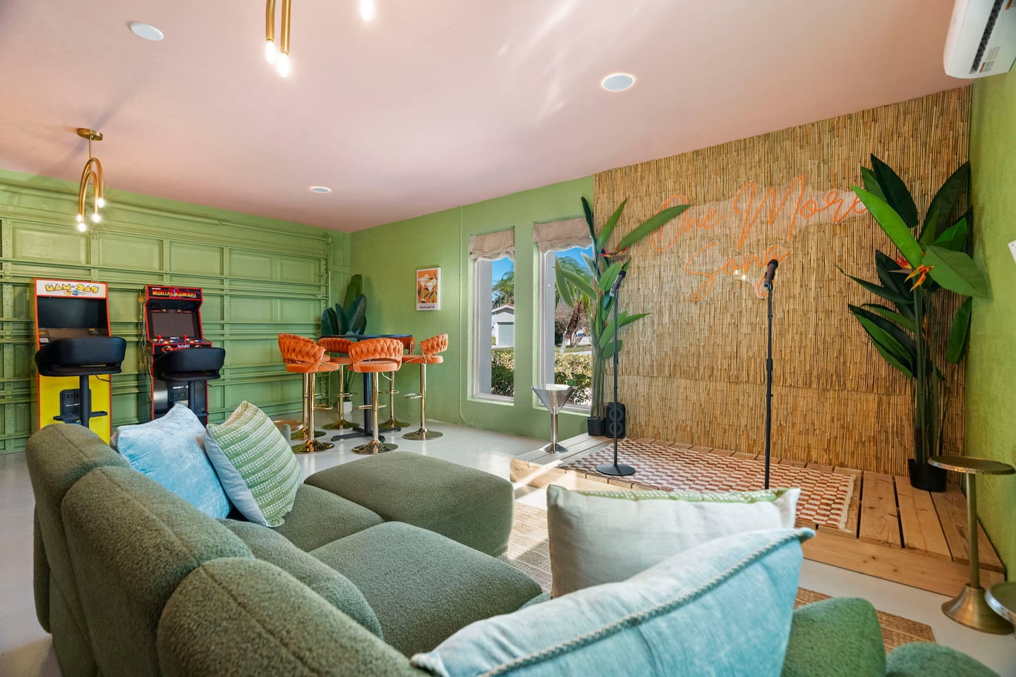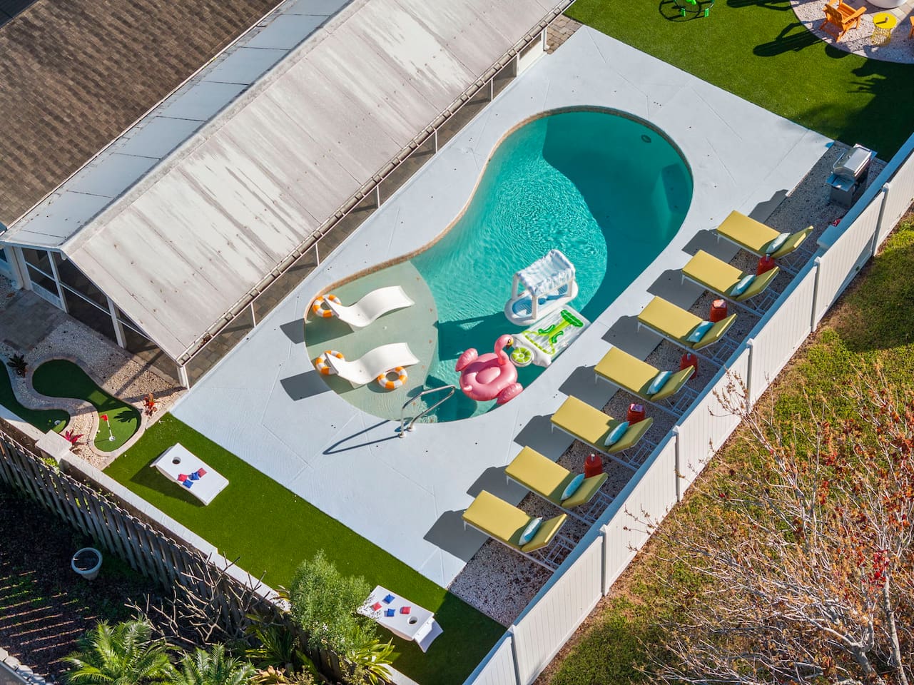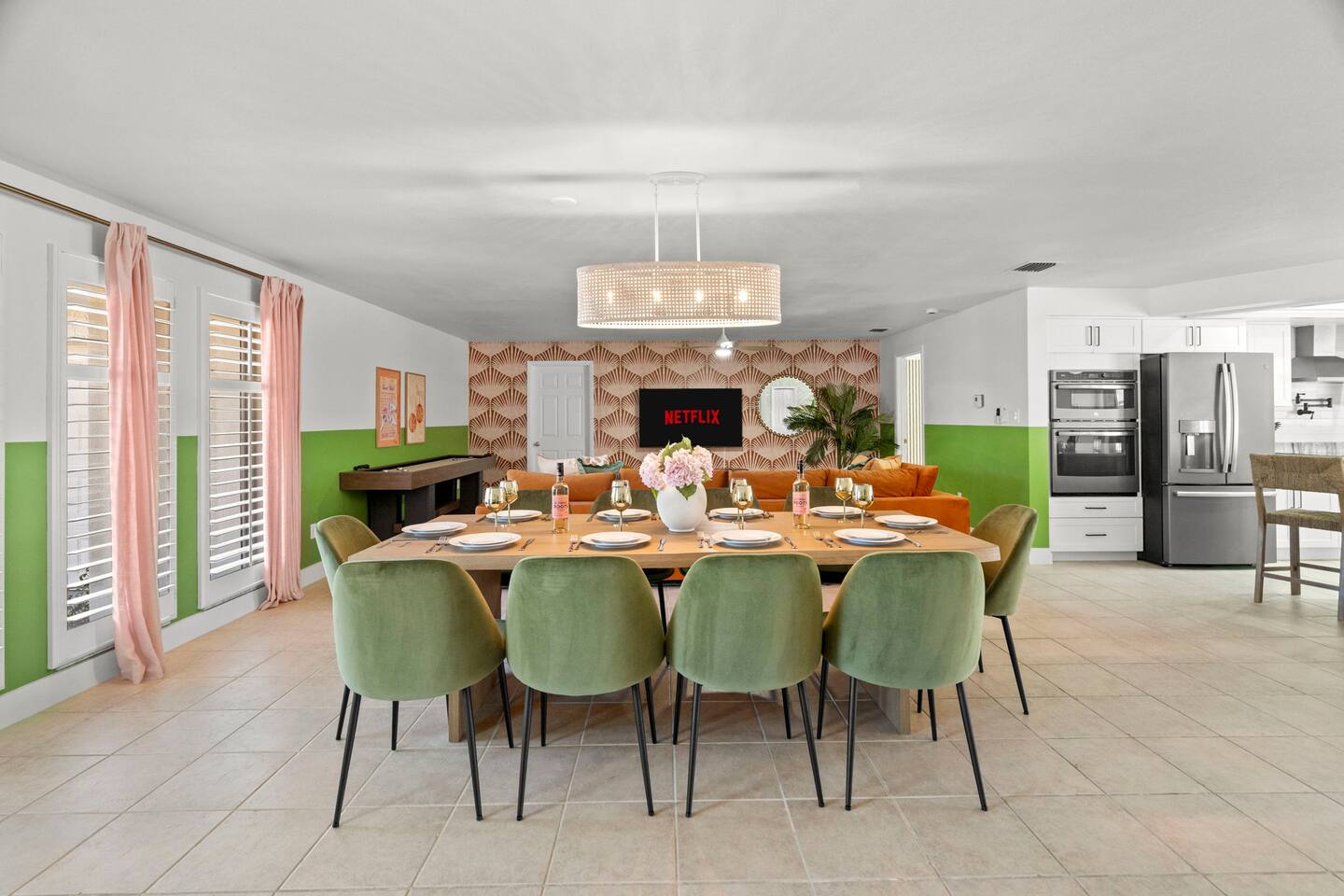 THE HONEYDEW HOUSE • Sleeps up to 14 guests comfortably • 2,143 sq ft single-family home • 3 bedrooms | 2 bathrooms • Professionally designed with a bold, playful, resort-style vibe • Built for families, girls trips, and group getaways • Packed with entertainment you won’t find nearby • Pool Safety Fence This home solves the biggest vacation problem: 👉 Everyone actually has something to do — without feeling on top of each other. 🛏️ SLEEPING ARRANGEMENTS Bedroom 1 – Primary Suite • King bed • Smart TV • Ceiling Fan Bedroom 2 – Queen Room • Two queen beds • Smart TV • Ceiling Fan • Work Desk in Room • Ensuite-style bathroom access Bedroom 3 – Bunk Room (Perfect for Kids or Groups) • Two full-over-full bunk beds (4 full beds total) • Sleeps up to 8 comfortably • Ceiling Fan 🛋️ Open-concept living spaces allow groups to spread out, relax, and reconnect without feeling crowded. 🍽️ KITCHEN & LIVING SPACES • Fully equipped kitchen for family meals or group dinners • Large dining area (sits 10) + island seating (sits 4) • Comfortable living room with Smart TV • Thoughtfully laid out for connection, not cramming 🌴 OUTDOOR RESORT-STYLE BACKYARD This is where The Honeydew House truly shines: • 🏊 Private HEATED pool - with optional pool safety fence to keep the family safe • ⛳ 4-hole putting green • 🍹 Tiki bar for poolside drinks • 🔥 Fireplace lounge seating for 8+ guests • 🍽️ Outdoor dining table for 6 • 🎯 Cornhole + Slammo game • 🍔 5-burner grill • 🪑 7 pool loungers for all-day relaxation Daytime fun → sunset cocktails → evening hangouts. 🎤 GAME ROOM FUN • Karaoke station • Games for all ages • Perfect for rainy days, late nights, or friendly competitions ⭐ AMENITIES HIGHLIGHTS 🏊 Heated Private Pool- with pool safety fence ⛳ Putting Green (4 holes) 🍹 Tiki Bar 🎤 Karaoke Game Room 🔥 Outdoor Fireplace 🍽️ Outdoor Dining (Seats 6) 🍔 5-Burner Grill 🪑 7 Pool Loungers 📺 Smart TVs 📶 Fast WiFi 🧺 Washer & Dryer 🚗 Driveway Parking for up to 5 vehicles 📍 LOCATION – CLEARWATER, FL You’re minutes from everything that makes Clearwater special: • Clearwater Beach – ~18 min • Pier 60 & sunset festivals – ~18 min • Downtown Clearwater – ~8 min • Tampa International Airport – ~23 min • Restaurants, grocery stores & coffee – under 5 min Perfect for beach days, boat rentals, dolphin tours — or staying in and enjoying your private backyard oasis. 🤝 GUEST EXPERIENCE YOU CAN TRUST ✔ Professionally managed by The Rental Realm ✔ Seamless self check-in ✔ Responsive host support We manage high-performing homes designed for comfort, cleanliness, and consistency — so you can relax and enjoy your stay.